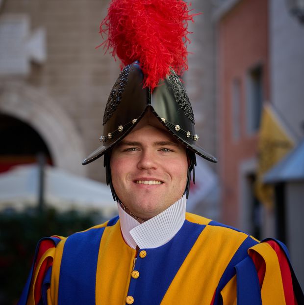 Dans le traditionnel uniforme de la Renaissance se trouve un jeune Suisse, moderne et bien formé. Aujourd’hui encore, il partage avec le mercenaire du XVème siècle la forte conviction que l’Eglise catholique et le successeur de Saint Pierre méritent que l’on s’engage pour eux, jusqu’en offrant si nécessaire sa propre vie pour leur défense. Tous deux ont un certain goût pour l’aventure dans un environnement international et la camaraderie; ils veulent expérimenter le domaine de la sécurité, approfondir leur propre foi, apprendre une nouvelle langue et découvrir la culture italienne. Dans ce climat méditerranéen ne mûrissent pas que des fruits sucrés, mais également la foi, les convictions, le savoir, l’amitié et la joie de vivre.